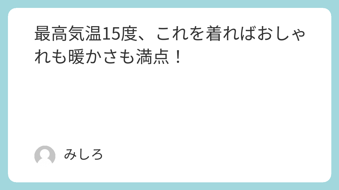 気温15度の日には、シンプルでありながらおしゃれなコーディネートが楽しめます。