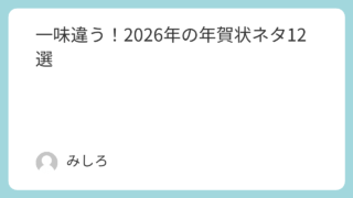 生活のアイデア みんなが真似したくなること間違いなし!一味違う、2026年の年賀状ネタ12選 2026年の年賀状作成に向けて、ユニークで面白いネタを探している方に向けた記事です。年賀状は新年の挨拶だけでなく、受け取る人を楽しませる大切なコミュニケーションツールです。この記事では、2026年の年賀状にぴったりな面白いネタやデザインのア... 2025.10.14 生活のアイデア