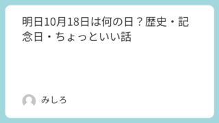 明日はなんの日 明日10月18日は何の日?歴史・記念日・ちょっといい話 日付が変わると毎日やってくる「今日は何の日?」。でも実は、次の日をちょっと早く知っておくだけで、朝の会話やSNS投稿がぐっと深くなるんです。この記事では、明日「10月18日」がどんな記念日かを分かりやすくまとめました。実は「統計の日」や「木... 2025.10.17 明日はなんの日